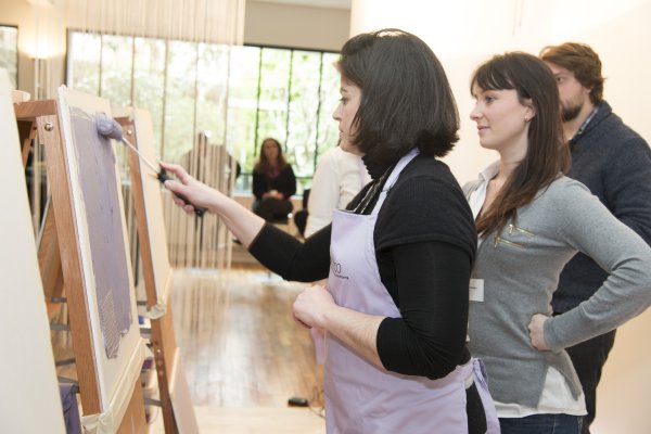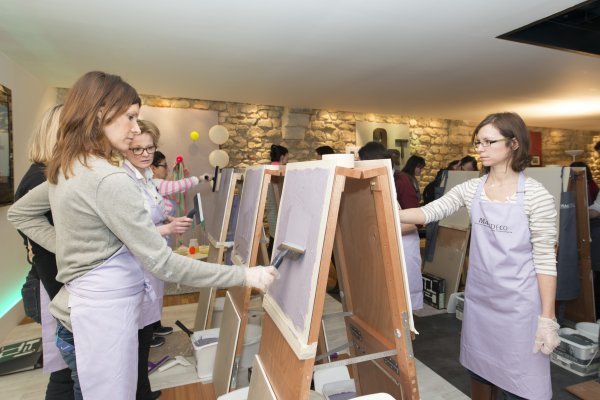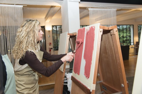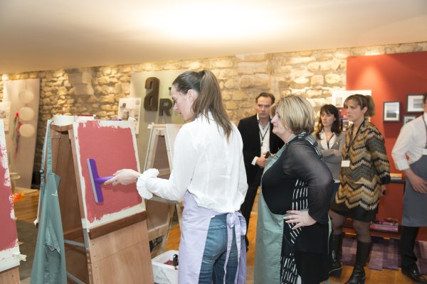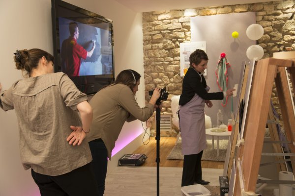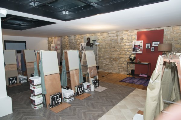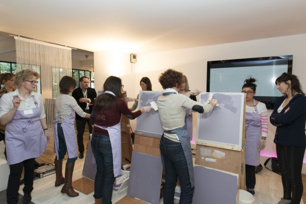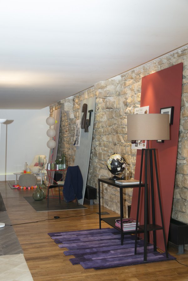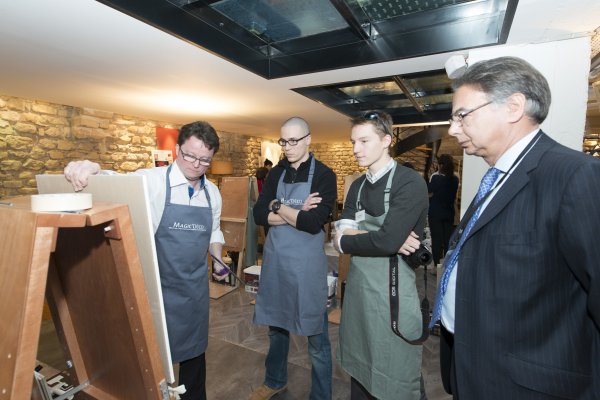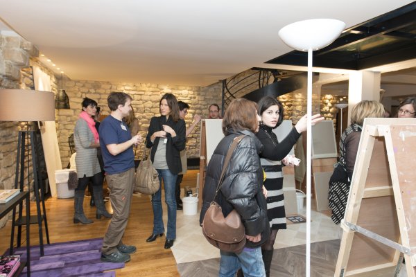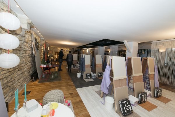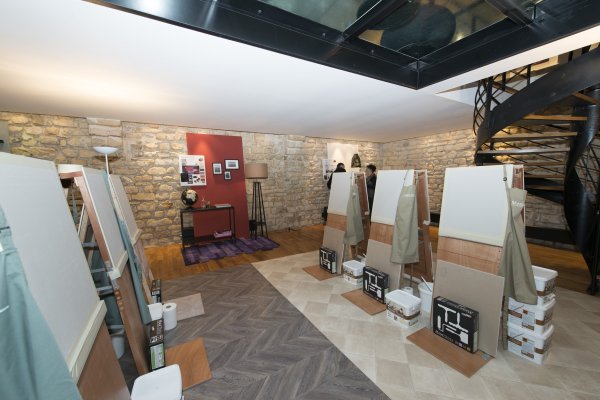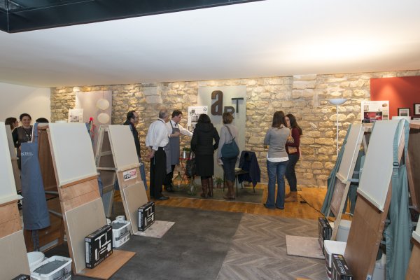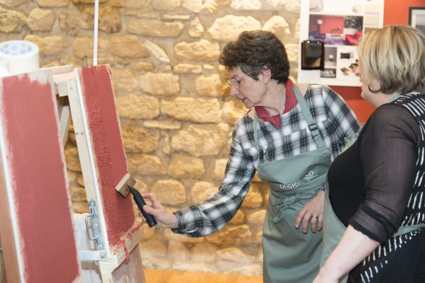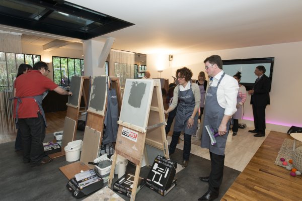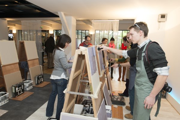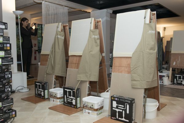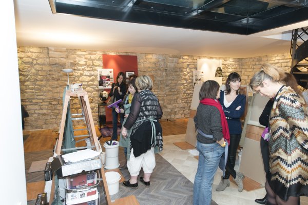 Nous descendons donc au rez-de-chaussé et découvrons la partie atelier du loft. TOUPRET a mis à disposition 4 espaces de travail, chacun étant dédié aux 4 produits Mac’Déco (Pierre, Terre, Béton & Soie). Des artisans sont à l’oeuvre afin de nous apprendre à utiliser ces produits.