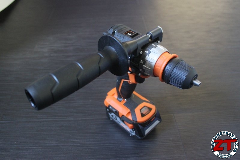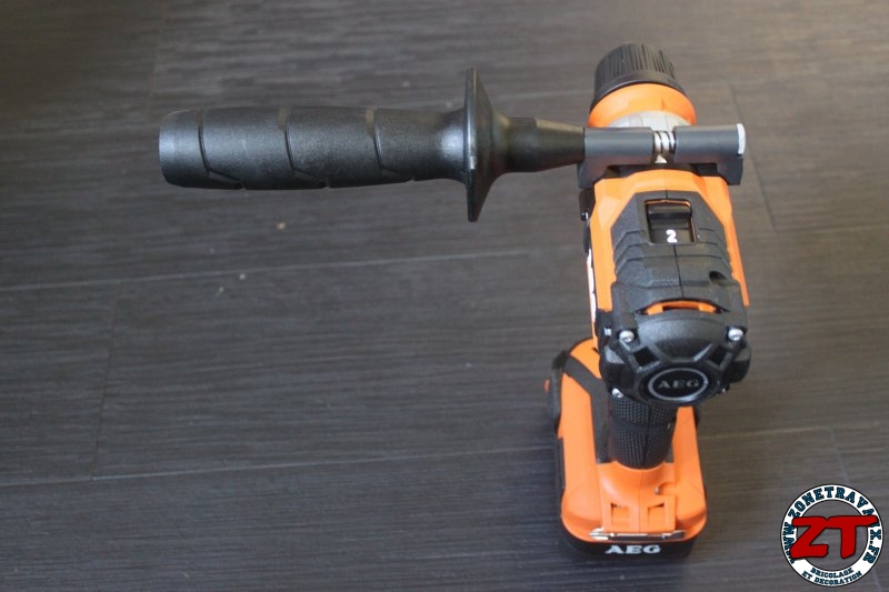 Pour les travaux plus lourd, une poignée de maintien est livrée avec la perceuse à percussion. Celle-ci s’adapte très facilement et peut être utilisée en droitier et en gaucher. En mode percussion, la poignée est un vrai plus !