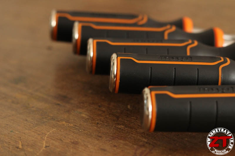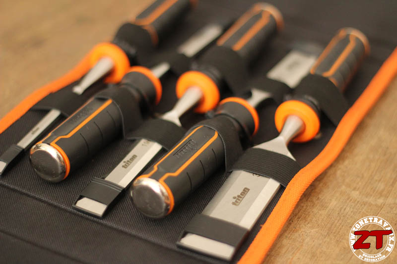 Le coffret se compose donc de 5 ciseaux à bois allant de 6mm à 32 mm afin de couvrir l’ensemble des besoins les plus courant. Les ciseaux sont rangés dans un étui en nylon noir sur lequel on retrouve le orange distinctif de la marque.