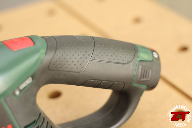 La poignée en softgrip dans laquelle la batterie vient se loger permet une bonne tenue en main. Elle est peut-être un peu grosse pour les petites mains mais rien de bien méchant.