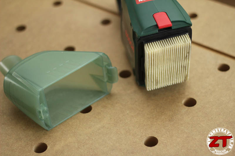 La seule réserve que j’ai concerne l’aspiration de poussières trop fines. Je l’utilise lorsque je perce un trou par exemple, ça me permet d’aspirer les poussières avant qu’elles ne tombent par terre, mais si je dois aspirer des poussières de ponçage ou du plâtre, je préfère utiliser mon aspirateur de chantier. En effet, le filtre papier sature vite sur de la poussière trop fine et l’EasyVac 12 perd alors trop vite sa puissance. Sans parler du nettoyage de celui-ci qui nécessite quand même d’avoir un compresseur sous la main pour y mettre un petit coup de soufflette.