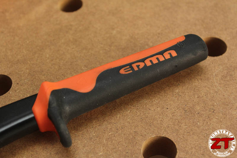 Comme d’habitude chez EDMA, on découvre une pince de très bonne facture fabriquée en France et conçue pour durer. Cela se traduit par une pince qui ne comporte pas de partie tranchante. Pour éviter de s’émousser et que le poinçon perde en efficacité au fur et à mesure de leur utilisation, celui-ci est en pointe et assez épais.