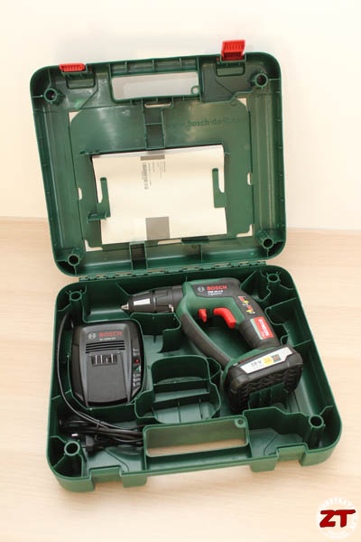 On retrouve évidemment la visseuse avec sa batterie, le chargeur ainsi que la notice d’utilisation :