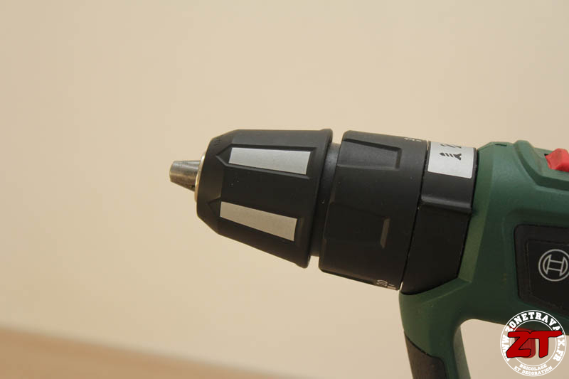 Du côté du mandrin, on retrouve le sélecteur de type de perçage. On passe du mode vissage tout à gauche, au perçage au milieu pour terminer sur le perçage avec percussion à droite.