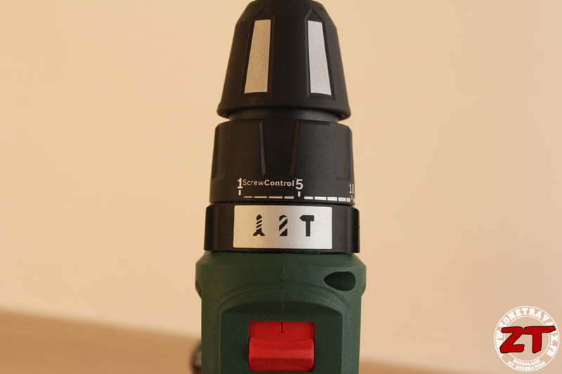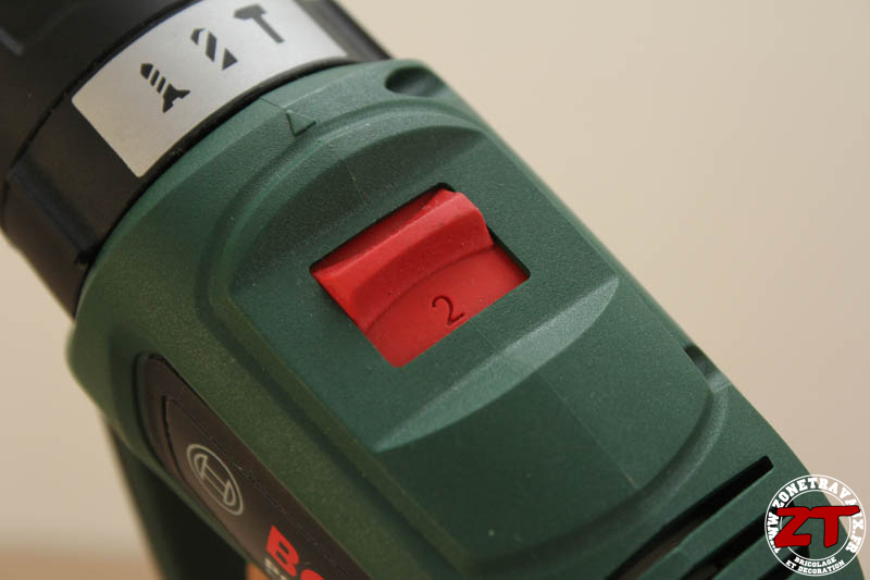 Sur le dessus, on retrouve le sélecteur de couple – Vitesse 1, lente avec couple élevé, vitesse 2 : rapide avec un couple moins important.