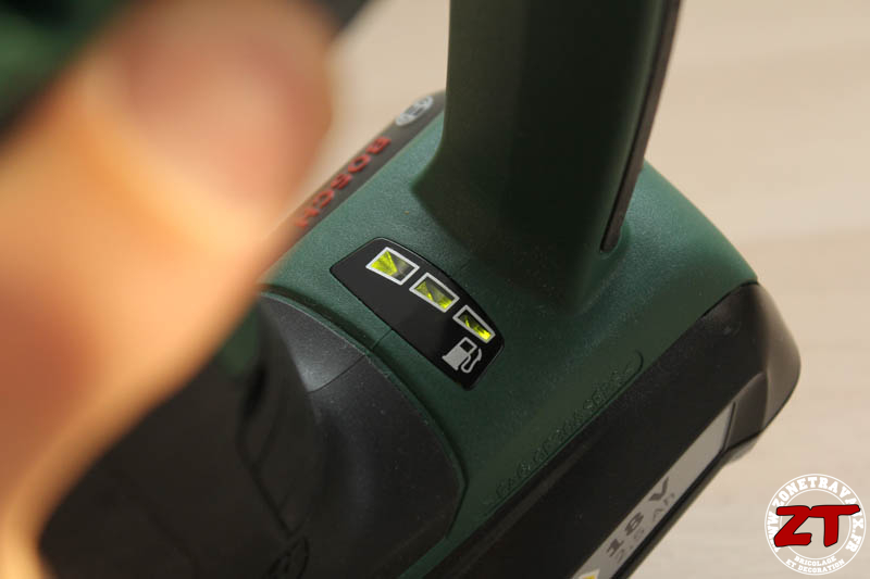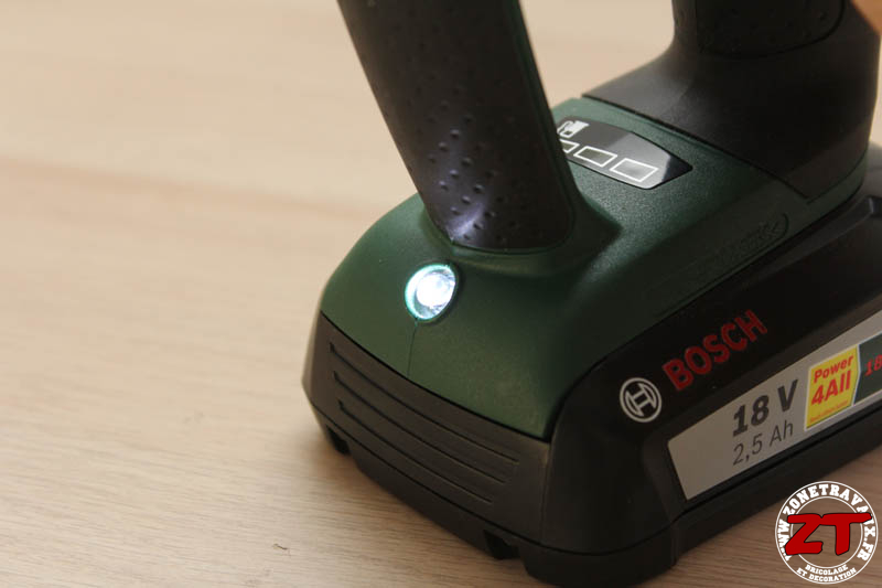 Entre les deux « manches » de la visseuse, on retrouve un indicateur du niveau de charge de batterie. Il faut noter que cet indicateur n’est pas des meilleurs que nous avons pu tester. Lorsque l’on se trouve légèrement sur le côté (comme c’est forcément le cas avec cette visseuse), on peut avoir l’impression de voir les 3 LED allumées, alors que l’une d’elle peut être éteinte.
