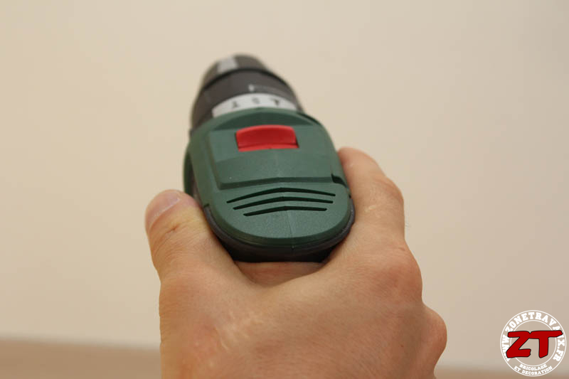 Enfin, comme je vous le disais tout à l’heure, on retrouve à l’avant de la gâchette un sélecteur qui permet d’inverser le sens de rotation de la visseuse. Ce sélecteur est étonnamment placé. Nous avons l’habitude d’avoir un bouton poussoir entre la gauche et la droite de la visseuse et je dois dire que l’idée est très intéressante car c’est à mon avis beaucoup plus intuitif pour des personnes non initiées à qui ce type de machine s’adresse.