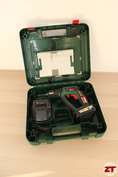 On retrouve évidemment la visseuse avec sa batterie, le chargeur ainsi que la notice d’utilisation :