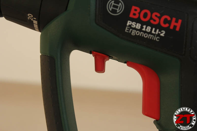 Enfin, comme je vous le disais tout à l’heure, on retrouve à l’avant de la gâchette un sélecteur qui permet d’inverser le sens de rotation de la visseuse. Ce sélecteur est étonnamment placé. Nous avons l’habitude d’avoir un bouton poussoir entre la gauche et la droite de la visseuse et je dois dire que l’idée est très intéressante car c’est à mon avis beaucoup plus intuitif pour des personnes non initiées à qui ce type de machine s’adresse.