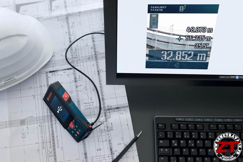 Le GLM 120 C Bosch Pro intègre une caméra et une optique de visée numérique avec fonction zoom. L’utilisateur peut ainsi voir rapidement et facilement où se situe la cible et viser avec précision le point de mesure, même avec une luminosité difficile, et ce jusqu’à 120 m de distance. L’appareil photo, d’une résolution de 5 MP, enregistre jusqu’à 700 images et affiche à l’écran les 50 dernières images, les valeurs mesurées et la date des prises de vue.