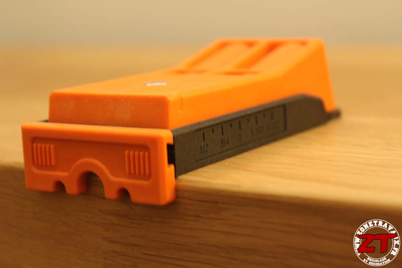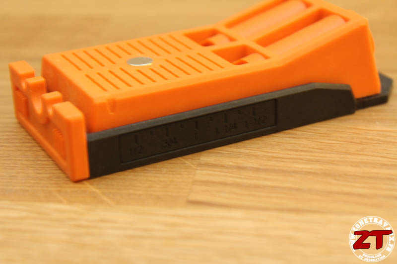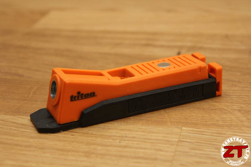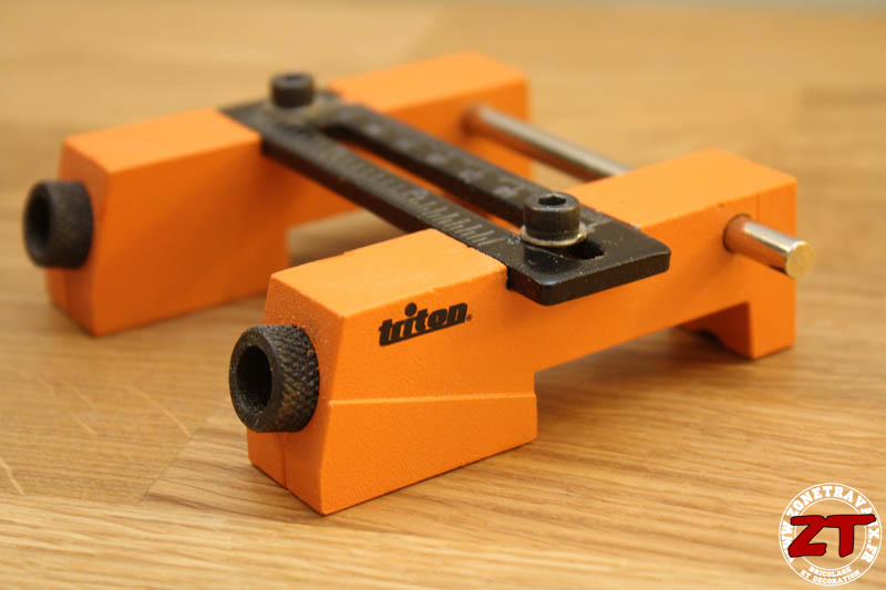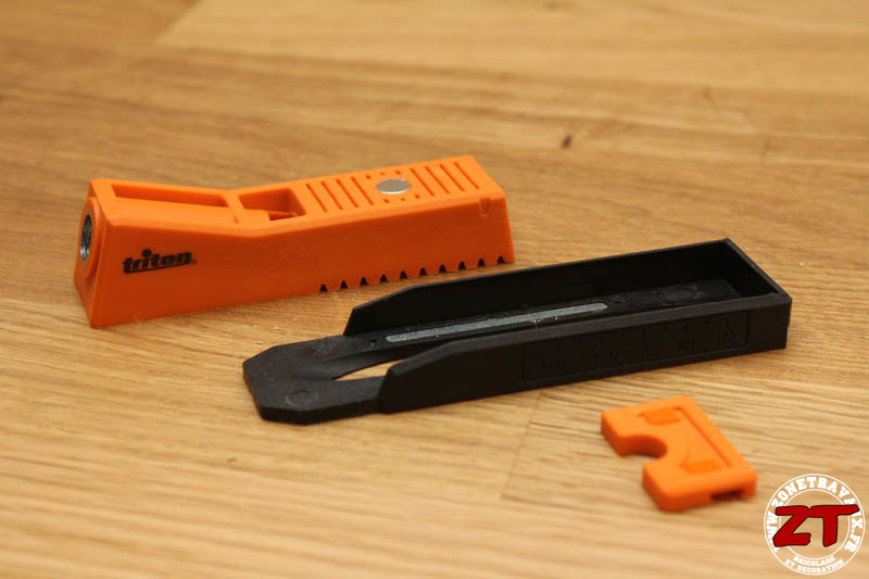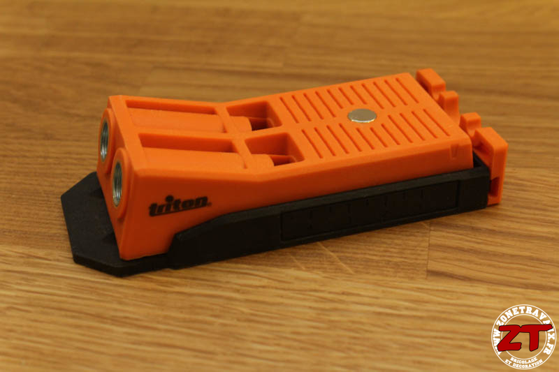 On retrouve la couleur orange caractéristique des outils TRITON sur la partie supérieure et un plastique noir sur la partie en contact avec le bois. Ces deux parties coulissent l’une sur l’autre pour permettre un réglage en fonction de l’épaisseur de la planche à percer.